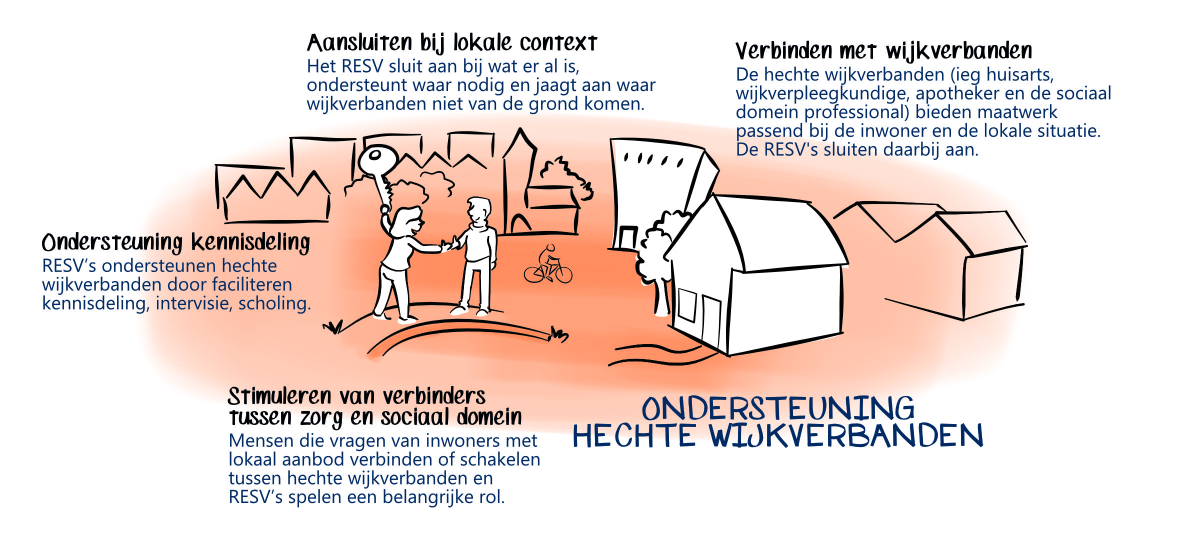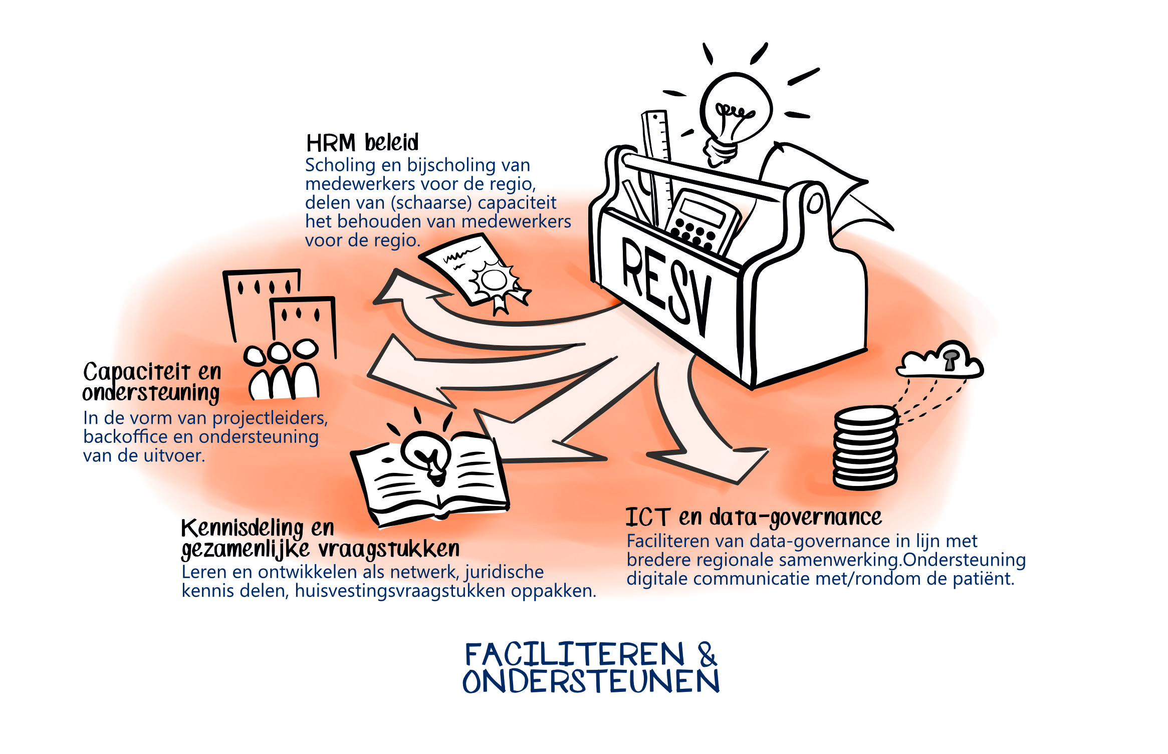 De Regionale Ondersteuningsstructuren (ROS’en) ondersteunen eerstelijnsorganisaties bij het bouwen aan RESV’s. Vanuit hun maatschappelijke rol helpen zij regio’s om samenwerking te versterken, partners te verbinden en het proces richting te geven.