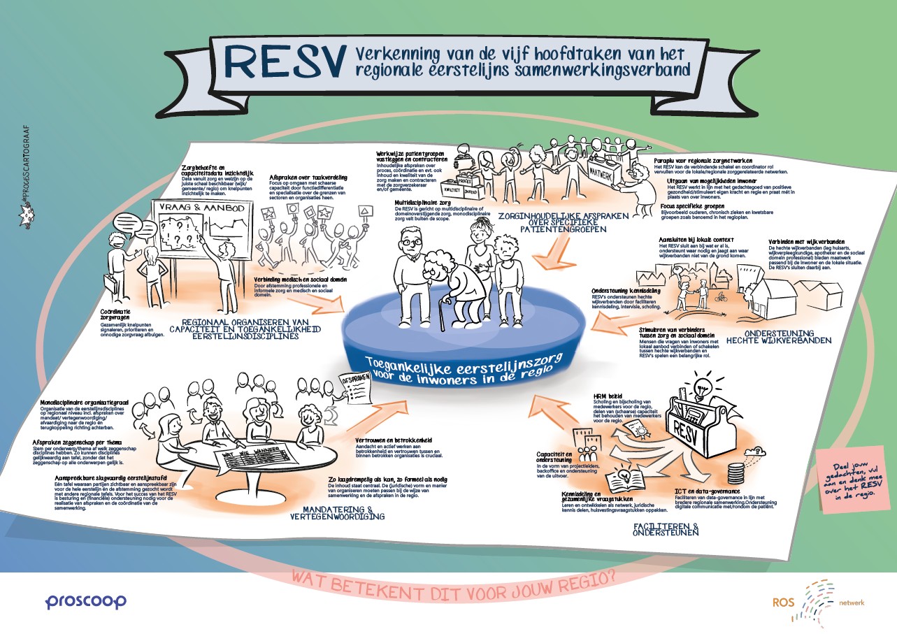 De ROS’en ondersteunen eerstelijnsorganisaties bij de vorming van Regionale Eerstelijnssamenwerkingsverbanden (RESV’s). Elke regio is anders, maar er zijn ook veel overeenkomsten. Daarom heeft Proscoop (ROS in Noordoost-Nederland) de kennis uit de regio’s gebundeld en in samenwerking met het ROS-netwerk verder uitgewerkt.
